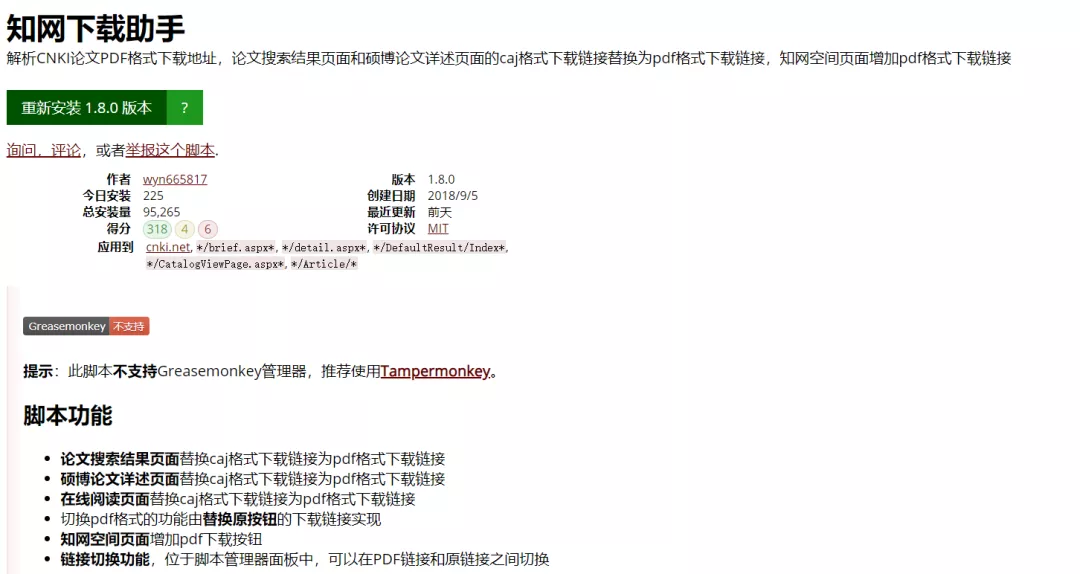 脚本主要功能:硕博论文详述页面替换caj格式下载链接为pdf格式下载链接。我们直接点击安装此脚本即可安装。