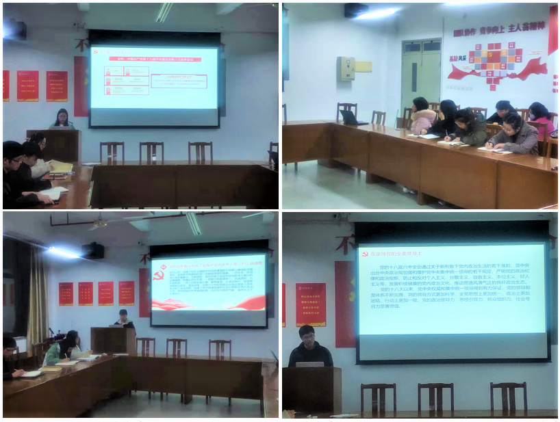 活动开始,党支部书记王嘉彤对本次会议的内容进行说明。接着,党小组第四组成员苏敏代领大家学习贯彻十九届六中全会精神,向大家叙述了建党百年之际,总结党的百年奋斗的重大成就和历史经验的原因。然后,她着重讲解了我党从夺取新民主主义革命伟大胜利到开创中国特色社会主义新时代的百年奋斗中获得的重大成就。之后,王文帅同学列举了党中央推出的重大举措,包括坚持党的全面领导、坚持人民至上、坚持理论创新等党领导人民经过长期实践积累的宝贵经验、精神财富——十大“坚持”。接着,黄强同学分享了党百年奋斗的历史意义和历史经验,以及指出新时代中国特色社会主义赋予当代青年的历史使命和责任担当。最后,支部书记王嘉彤对会议内容进行了总结,并强调了“百年奋斗铸成就,初心不改绘未来”主题所要传达的精神。