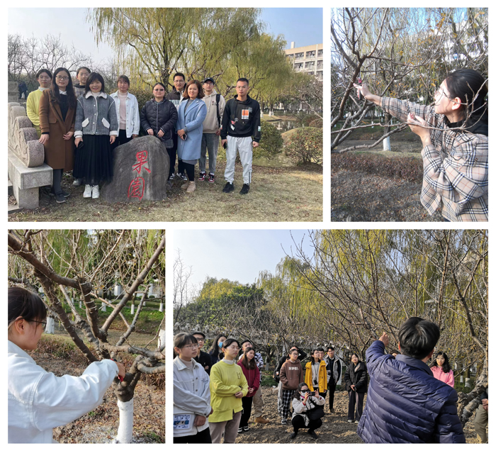 冬季是果树的休眠期,也是修建整形和施肥的好时候。活动开始后,后勤保障部果园园艺师傅简单介绍了果园,让大家对上大果园有了基础的认知。一路浏览之后,园艺师傅带大家来到了实践场地樱桃园。果园师傅将理论知识与实际操作相结合,指导同学们如何修建樱桃树的树枝并合理施肥,并分享了许多细节。老师和同学们认真听讲、虚心请教,自行分组,分工协作。“咔咔嚓嚓”,剪刀落下的是对来年的期许;“嘿咻嘿咻”,铲子刨出的是对来年丰收的祝福。最后,同学们也通过立牌记录下自己的劳动成果,待春花烂漫时,再来打卡这满树缤纷。