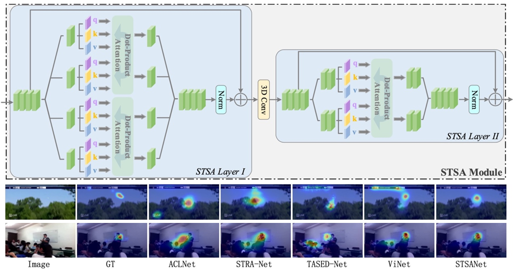 三维卷积神经网络在视频注视点预测(显著性预测)任务中展现了颇具前景的结果,然而三维卷积仅能够在局部时空范围内编码视觉表征,实际上人类视觉注意力往往被视频中不同时间上的关联视觉特征所吸引。为了克服该局限,作者提出了一种基于时空自注意力机制的三维卷积神经网络(STSANet)。该网络在多尺度视觉表征上采用时空自注意力方法,提取不同时间上时空特征之间的全局相关性,以增强不同视频帧中的关联特征,实现了视频注视点预测准确度提升。