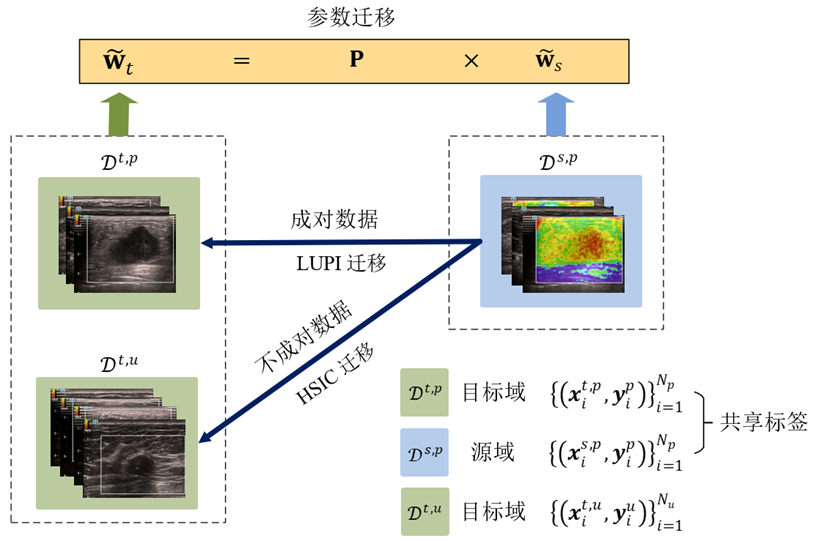 (3)论文提出一种双重监督迁移学习算法用于处理模态不平衡的多模态医学影像数据,其迁移学习由两部分模块构成:采用特权信息学习范式实现共享标签的成对数据之间的迁移,采用希尔伯特-施密特独立性准则实现非共享标签的不成对数据之间的迁移,从而能充分利用并挖掘所有双模态和单模态数据的可迁移信息,有效提升单模态影像CAD性能。
