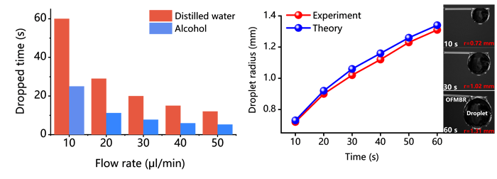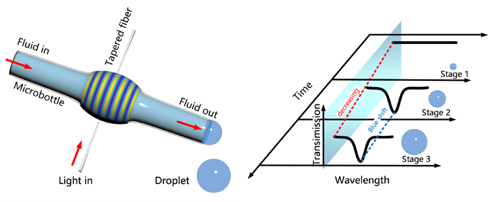 在该成果中,由于液体表面张力和固液界面力的存在,液体从器件端面流出后沿其径向形成悬垂液滴,其最大液滴质量与液体表面张力系数正相关;随时间增加,液滴重力使谐振腔与光纤锥挤压,导致谐振腔谐振波长漂移;此外,由于不同液体具有不同的表面张力系数,最大波长漂移量不同,实验结果与弹性力学纳维方程的理论仿真相一致,因此通过实时观测波长漂移量与最大波长漂移量可实现液滴质量、尺寸监测和液体种类识别。该工作为液滴速度监测、液滴产生与计数提供一种新型光学监测方案,在生命科学和生物应用等微流控技术领域具有重要应用前景。