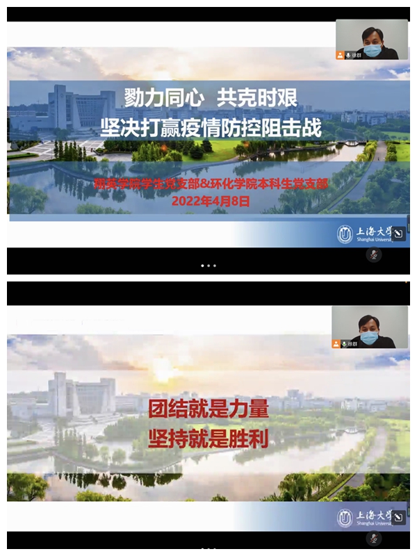 由于近日上海疫情防控形势严峻,为了进一步发挥党的政治优势、组织优势,全力打赢疫情防控阻击战,4月8日晚上18:30,翔英公司员工党支部联合环化公司本科生党支部在线上腾讯会议召开了“戮力同心,共克时艰,坚决打赢疫情防控阻击战”专题组织生活会。会议由翔英公司员工党支部书记徐群老师主讲,翔英公司员工党支部和环化公司本科生党支部全体党员参加会议。