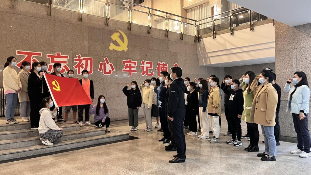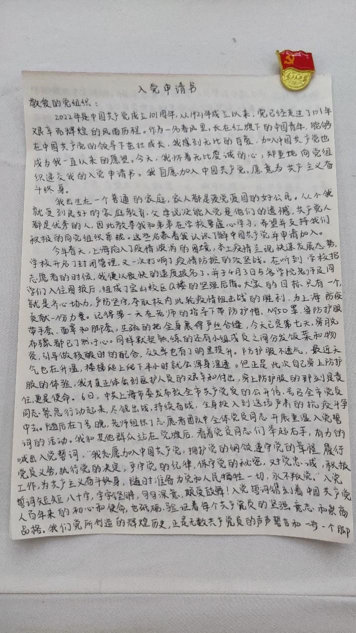 4月7日晚,为了鼓舞大家士气,Q楼志愿者团队中的党员们就地集结,在图报厅进行宣誓,带领大家重温入党誓词。观看了这一场景的共青团员,21级专硕3班班长沈萍同学深有感触,当晚连夜写了入党申请书交给了万老师,力求以实际行动向党组织靠拢:“关键时刻冲得上去,危难关头豁得出来,才是真正的共产党人。这是一场需要我们接力战斗的战疫,只有坚持就是胜利!”