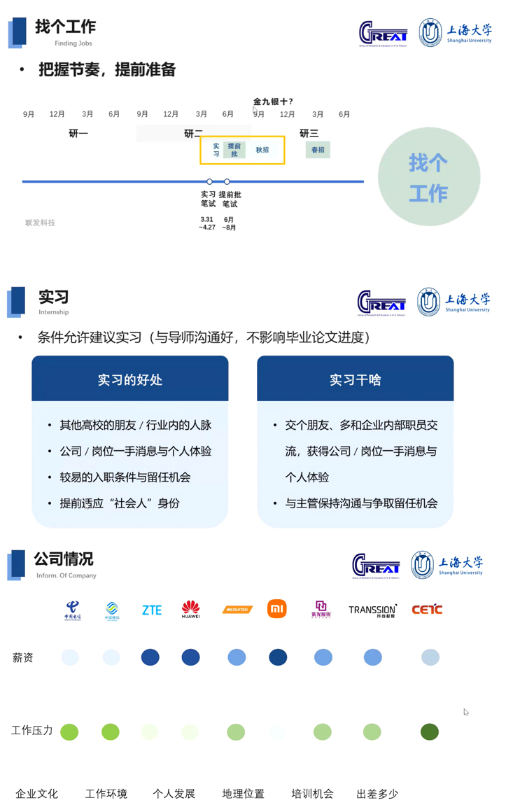 在就业方面,陆学长认为实习有益于就业,可提前获得企业相关信息,这些信息相较于网上的信息更具客观性和说服力,也可判断自己是否适合这家企业或这个岗位等问题。最后他也分析了通信类员工的就业去向,为同学们讲述了不同企业的优劣势,供大家参考。