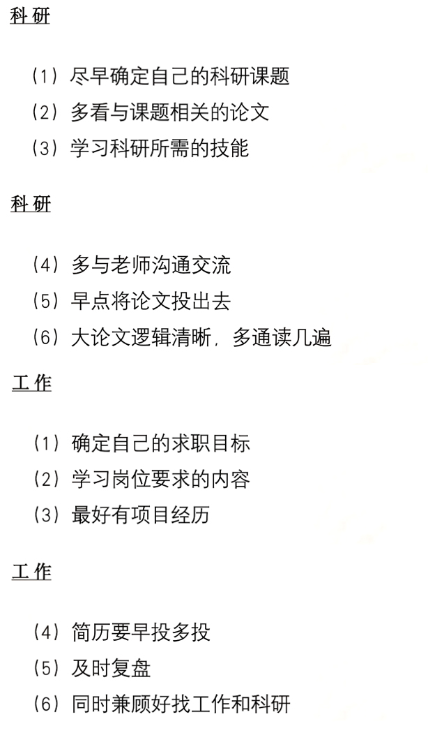 3.尽早完成毕业指标,尽快撰写毕业论文,理清逻辑思路,搭建论文框架。
