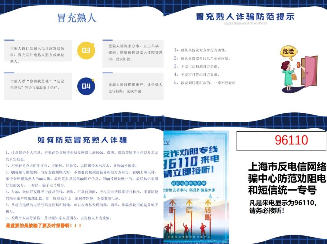 上海市反电信网络诈骗中心防范劝阻电话和短信统一专号:凡是来电显示为 96110,请务必接听!