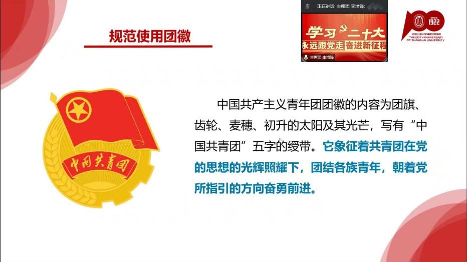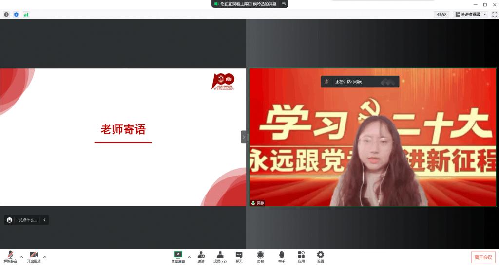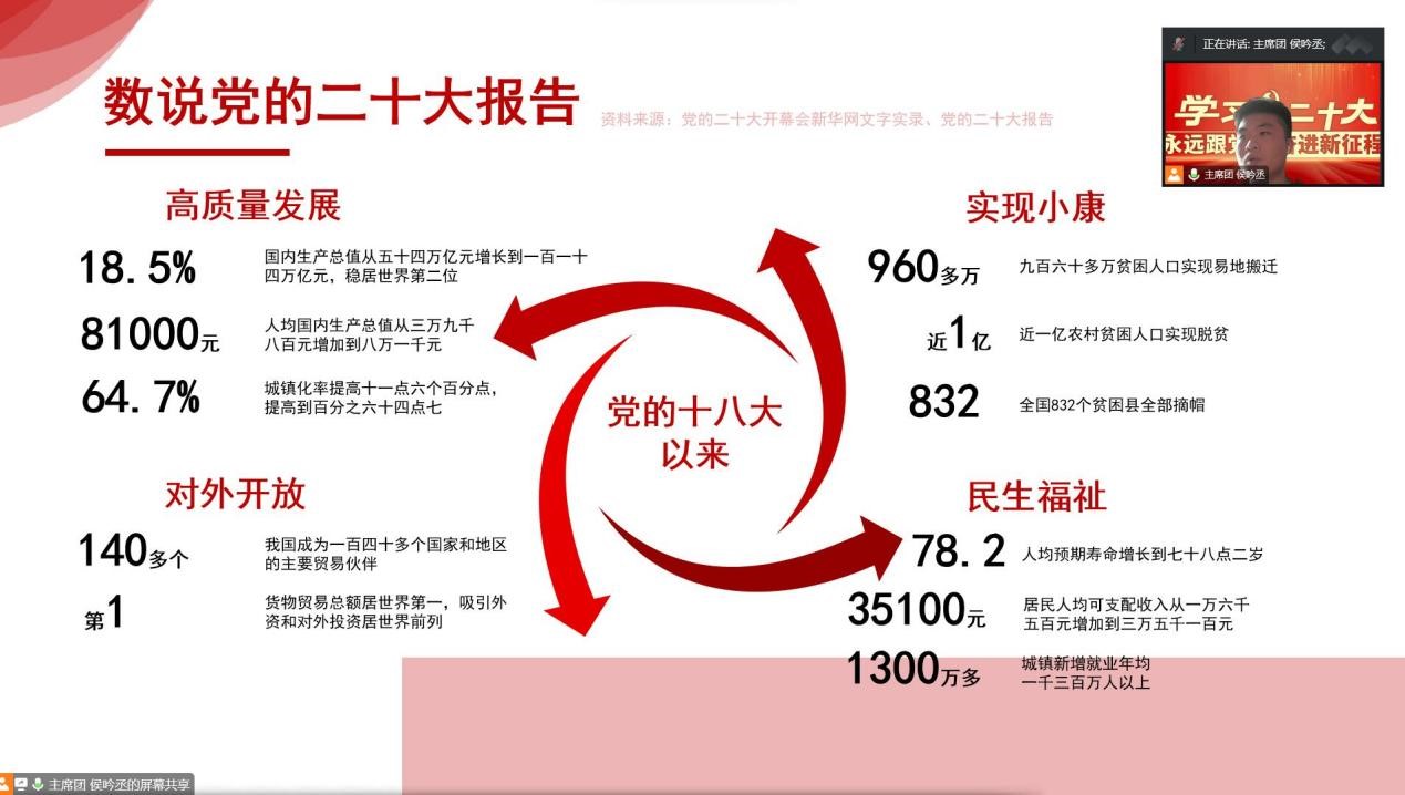 观看结束后,侯吟丞同学以“学习二十大,永远跟党走,奋进新征程”为主题,带领同学们学习了党的二十大相关知识,并数据化地展现了二十大报告的要点,更好地领会了会议精神,最后以习近平总书记的“青年强,则国家强”为结束语,与大家共勉。