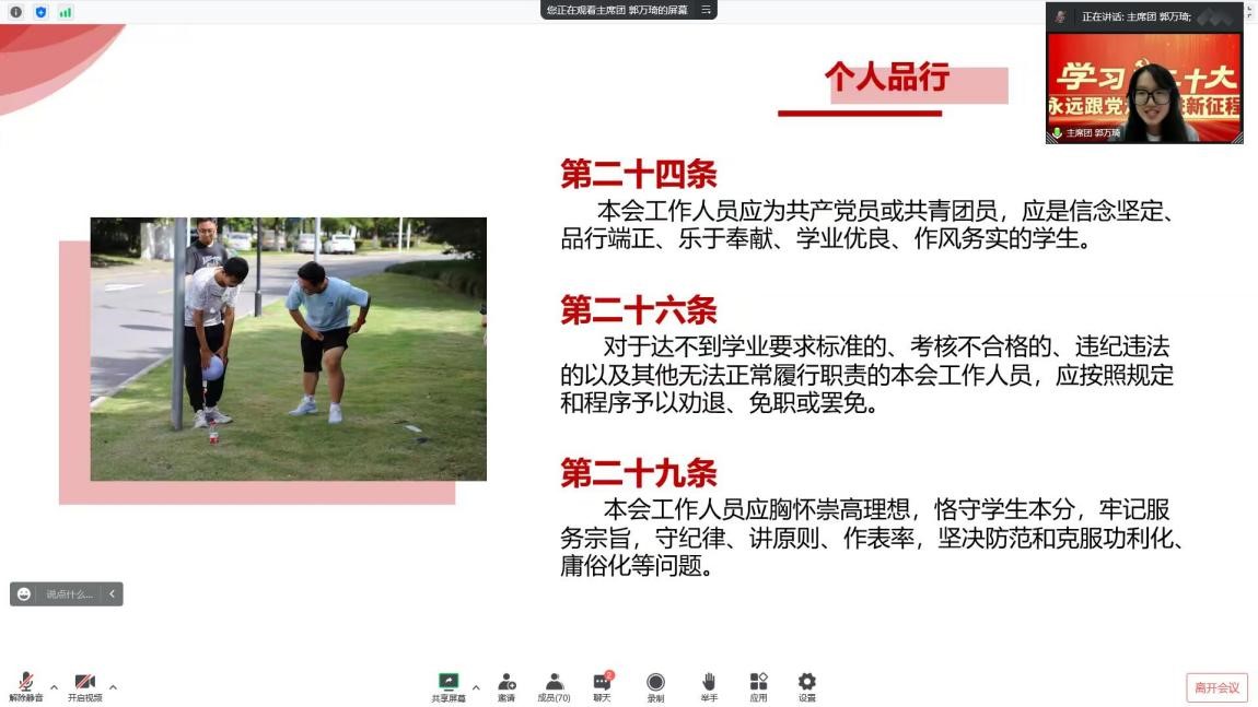 为贯彻落实全国学联关于员工会组织的工作要求,提升本届员工会政治认识与服务能力,公司团委组织员工会于10月21日下午在线上开展了yl23411永利集团员工会秋季学期培训会。公司团委书记吴静老师、团委副书记李文华老师及团学组织全体成员出席本次活动。本次培训会由员工会主席团成员侯吟丞同学主持。