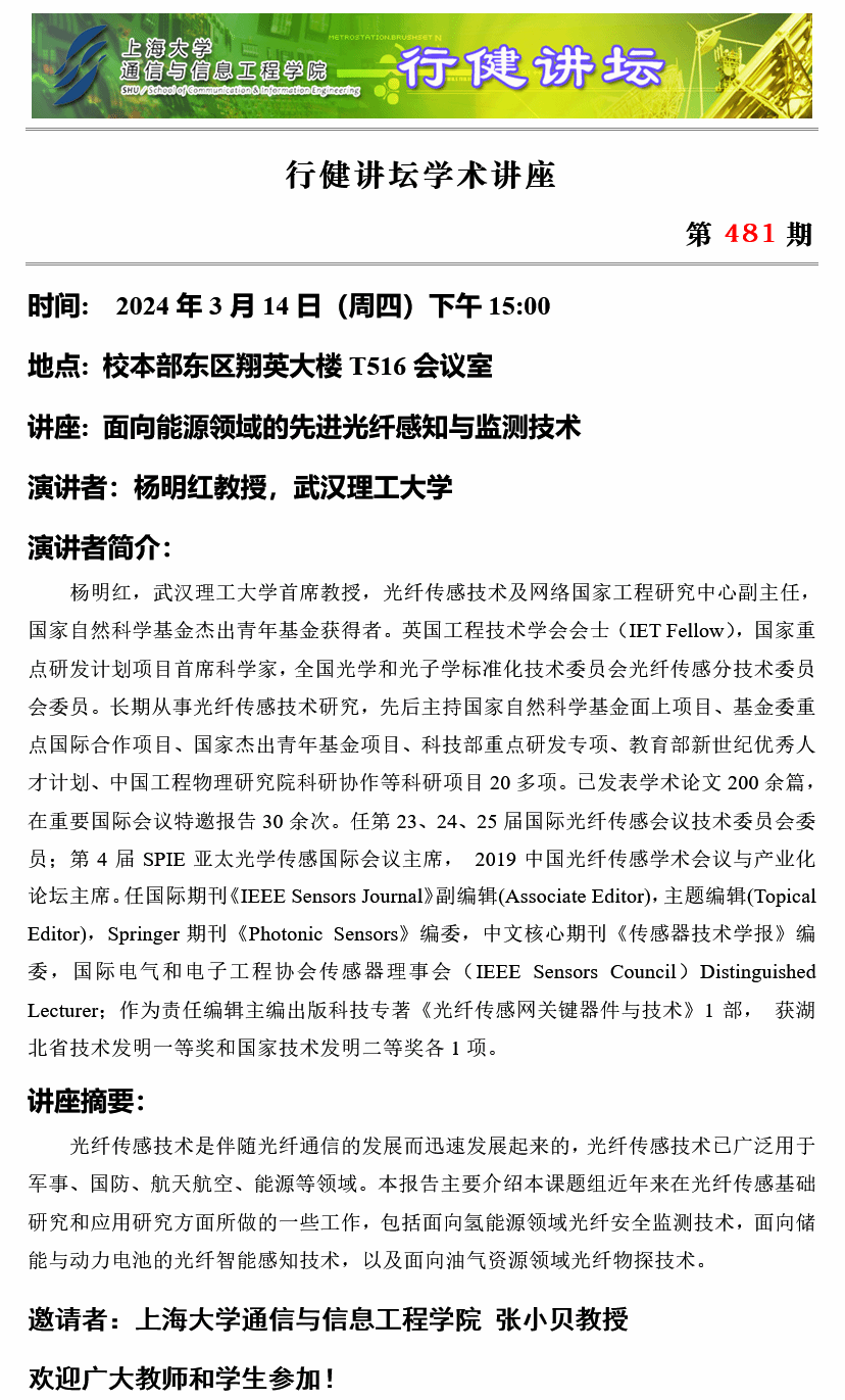 上一条:行健讲坛 №482 -光纤传感和仪器在生物医学中的应用 下一条:行健讲坛 №480 -光纤光声气体传感技术及应用