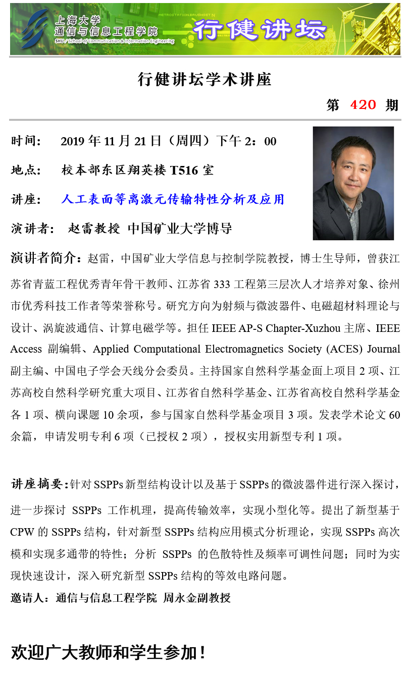 上一条:行健讲坛 №421 -平行耦合线在微波无源电路及天线阵中的应用 下一条:行健讲坛 №419 -滤波器驱动四波混频激光微腔光频梳